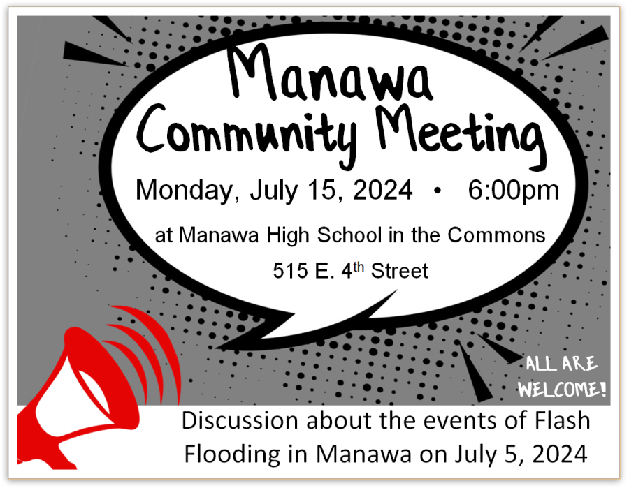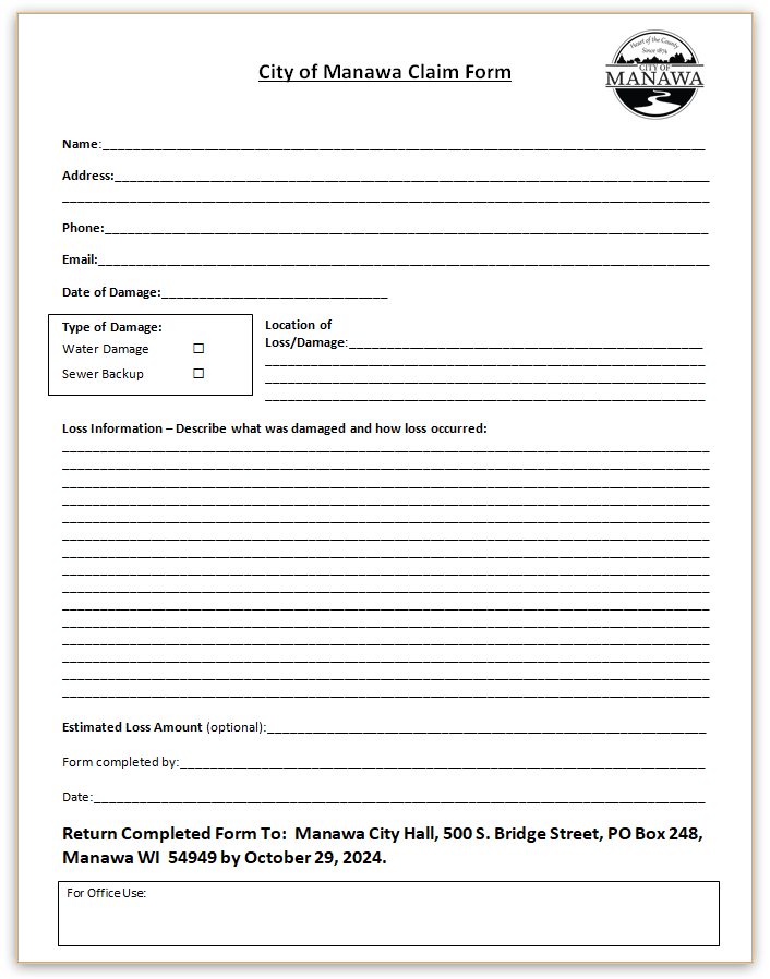 If you have water or sewer damage inside your home due to the flash flooding on July 5, 2024 please fill out the City of Manawa Claim Form and submit to the City Hall. There is a possibility that the City’s insurance may reimburse you some funds. Forms will also be available at the Community Public Meeting on July 15, 2024. Click the picture below for a printable form