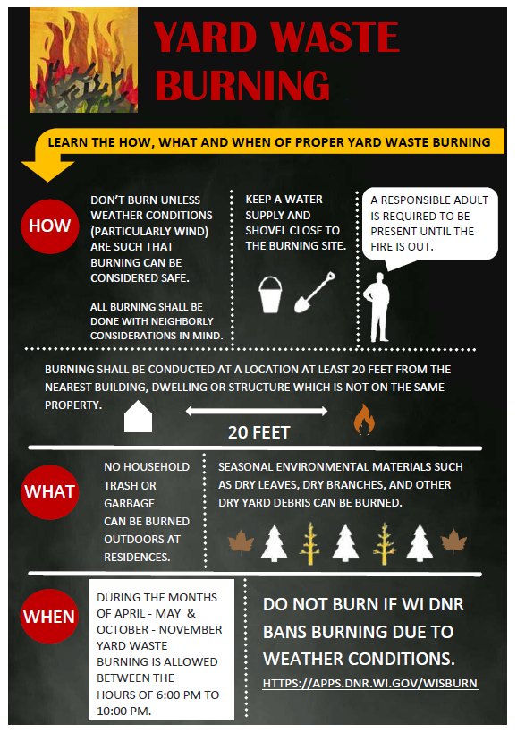 — Burning – Yard waste can be burned in the months of April-May and October-November. Burning hours are 6pm – 10pm. Piles can not be any larger than 3 feet wide x 3 feet high. Residents need to follow burning condition restrictions set by Wisconsin DNR. Follow this link for restrictions http://dnr.wi.gov/topic/ForestFire/restrictions.html