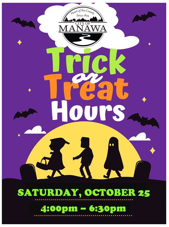 — Trick or Treat hours for City of Manawa will be Saturday, October 25, 2025 from 4:00pm – 6:30pm.