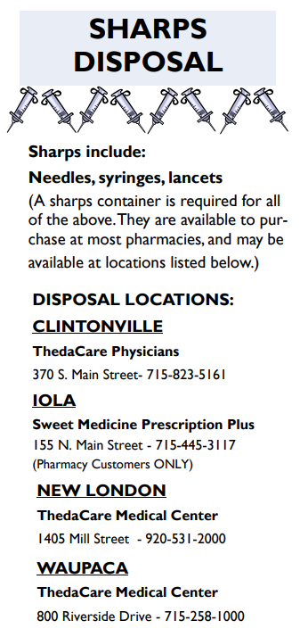 Needles, lancets, syringes, thermometers, IV bags, nebulizer machines, diabetes test kits, personal care products (shampoo, lotion, etc.). Click here for Sharps disposal locations.
